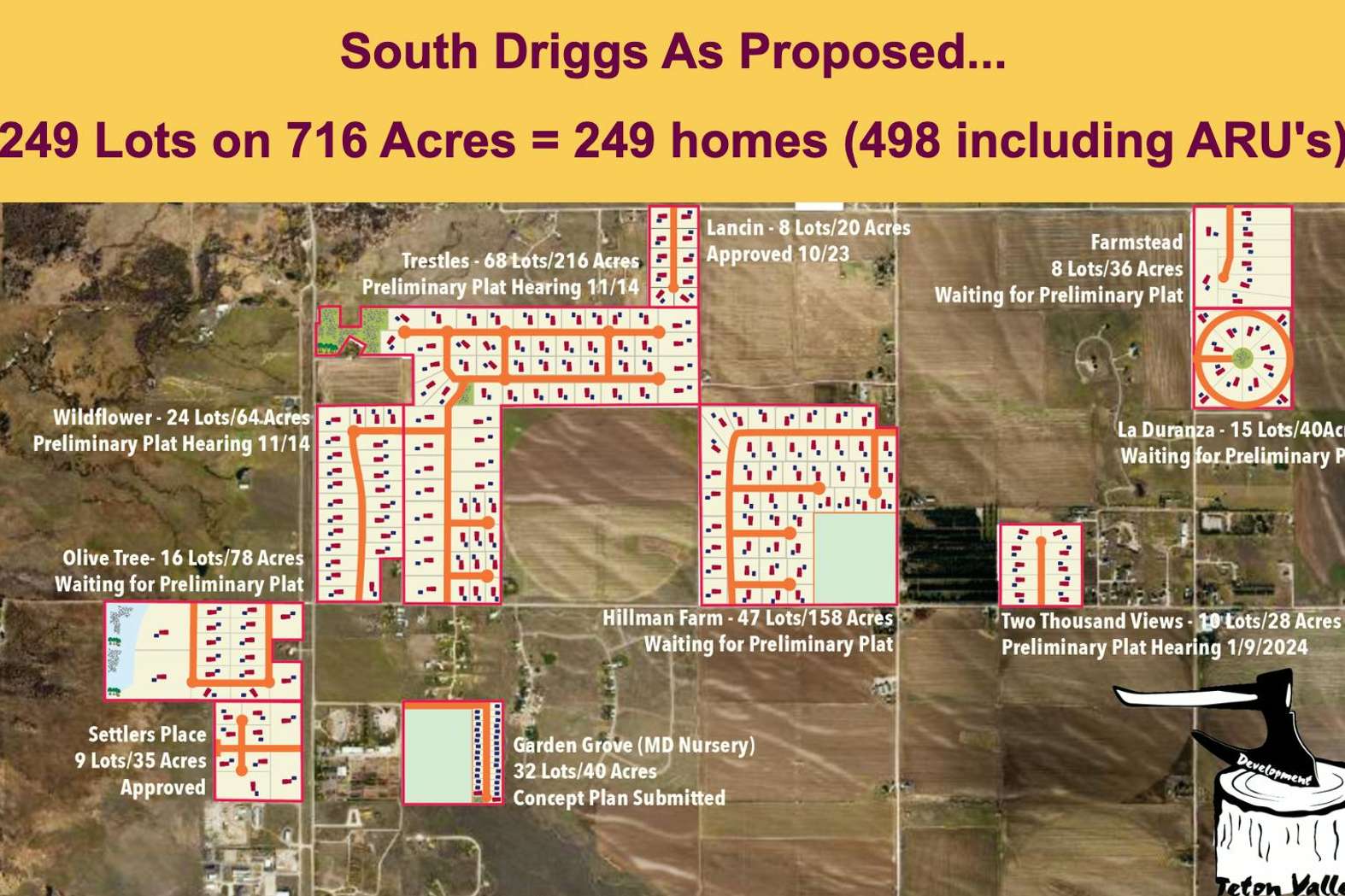 The Scenic Corridor and southern entrance to Driggs is on the chopping block. With 8 subdivisions pending in this area alone, the impacts that would come with this scale of development, in this location, are extraordinary.
